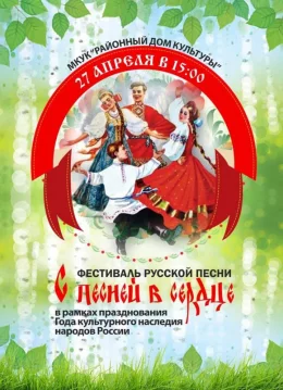 27 апреля в 15.00 в рамках празднования Года культурного наследия народов России состоится фестиваль русской песни «С песней в сердце». Русская народная песня, как и русский язык – общедоступное достояние России и всего мира. Через русские песни в наших сердцах живут образы, смыслы и ценности нашего Отечества. Это уникальный самобытный памятник культуры, сочетающий в себе природные богатства Русской земли, характерные черты русского народа, традиции русского быта. Выявление, поддержка и воспитание юных дарований в области профессионального и народного творчества, пропаганда духовно - нравственных ценностей в молодежной среде. Развитие познавательного интереса к культурному наследию страны.